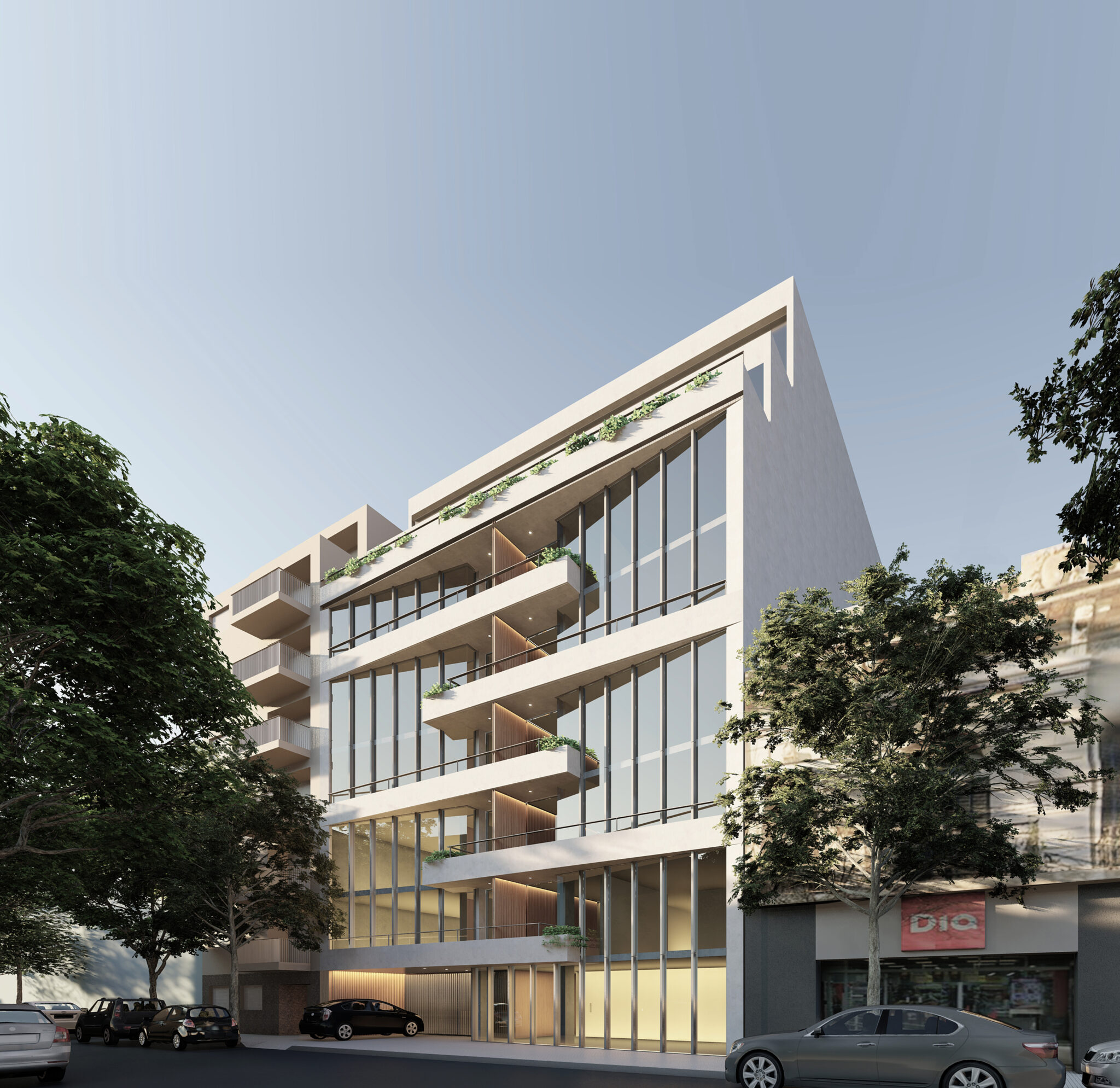 La fachada completa el perfil urbano y sus balcones intercalados buscan brindarle dinamismo a una zona en crecimiento.